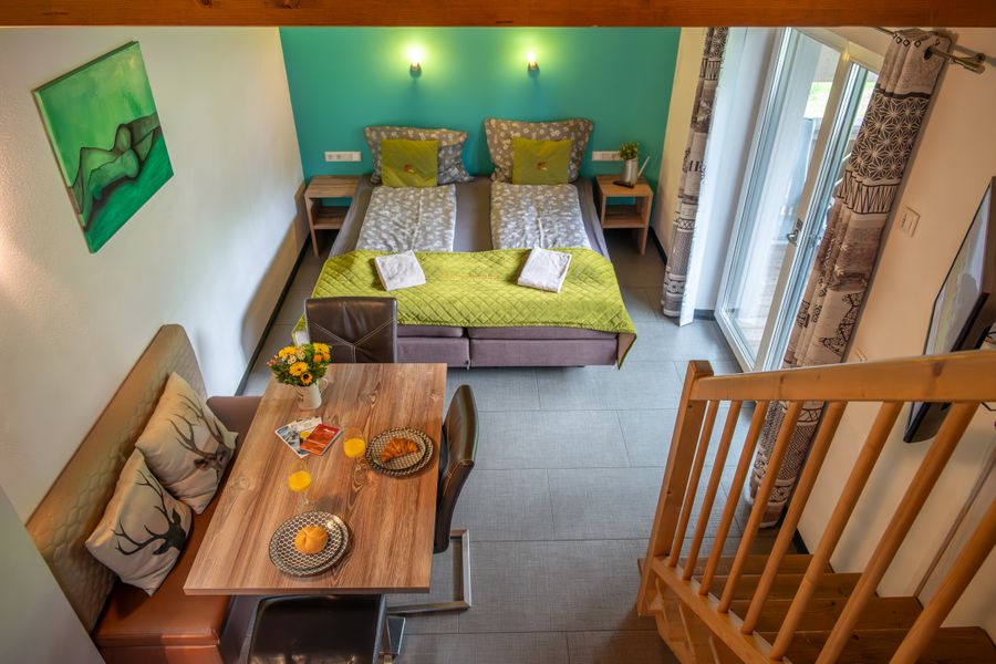 Der offene Wohn- und Schlafbereich ist hell, freundlich und modern eingerichtet. Eine kleine, gut integrierte Küche sowie ein Esstisch für bis zu vier Personen machen das Apartment ideal für entspannte Urlaubstage. Das Boxspringbett lässt sich flexibel als Doppelbett oder als zwei Einzelbetten nutzen – je nach Bedarf und Reisegruppe.