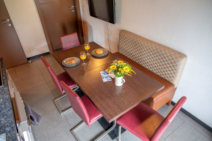 Im Mittelpunkt steht die moderne Wohnküche mit einem großzügigen Esstisch für bis zu sechs Personen – perfekt für gemeinsame Mahlzeiten, Spieleabende oder einen entspannten Start in den Tag. Die Küche ist vollständig ausgestattet und bietet alles, was man für einen unkomplizierten Aufenthalt benötigt.