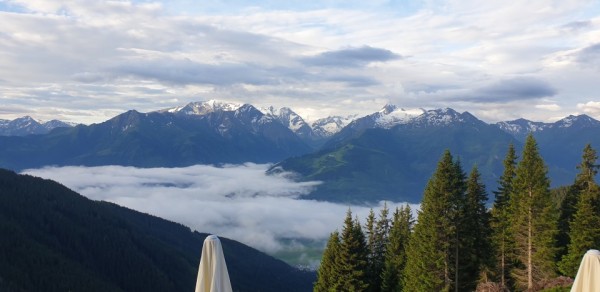 Ab und zu weht eine frische Brise und muss die Jacke wieder angezogen werden, dann ist es plötzlich wieder warm und ziehen wir unsere Jacke wieder aus. Alles geht gut, wir geniessen die fantastische Aussicht. Wir gehen durch sumpfige Wiese, begegnen Kühen und Pferden und geniessen die Ruhe. Es ist unbeschreiblich schön auf einer Höhe von 2000 Metern. Wir sehen Piesendorf, Walchen, Niedernsill und Uttendorf; alle diese Orte liegen 1000 Meter tiefer. Auf der anderen Seite des Berges sehen wir die Skilifte von Saalbach und Hinterglemm. Ab und zu gibt es eine Steigung. Wir treffen niemanden und behalten die Wolken im Auge. Eigentlich ist das Wetter ideal, denn wenn die Sonne den ganzen Tag scheinet, wäre es zu heiß und würde ich wahrscheinlich Kopfschmerzen haben. Mir geht’s gut, das Wetter ist schön und wir gehen weiter.