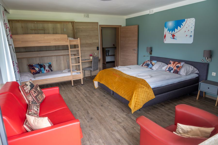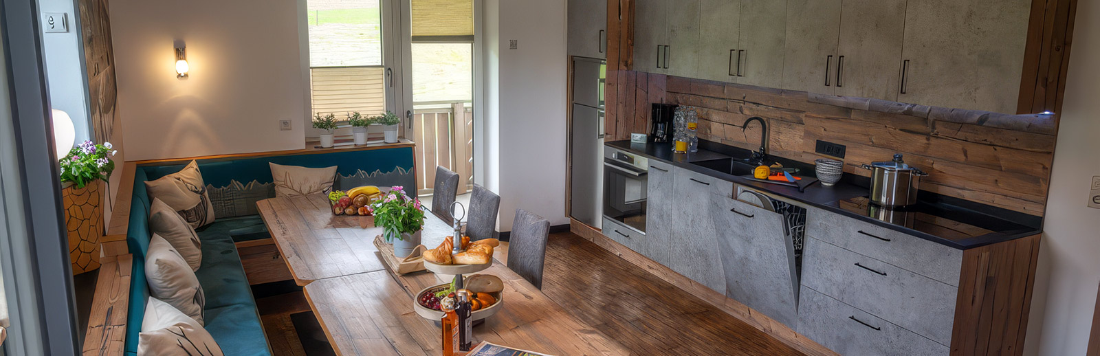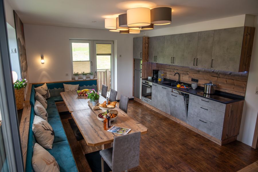 Im Mittelpunkt steht ein sonniger Wohn- und Essbereich mit offen integrierter Küche, der viel Platz für gemeinsame Mahlzeiten, gesellige Abende oder entspannte Stunden bietet. Die Wohnung ist so gestaltet, dass sich Gruppen hier ganz selbstverständlich verteilen können: Mehrere Schlafbereiche in unterschiedlichen Größen sorgen für flexible Belegung, während zusätzliche Schlafmöglichkeiten im Wohnbereich den Komfort noch erweitern.