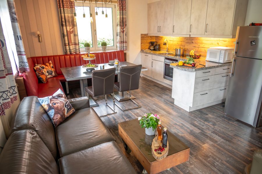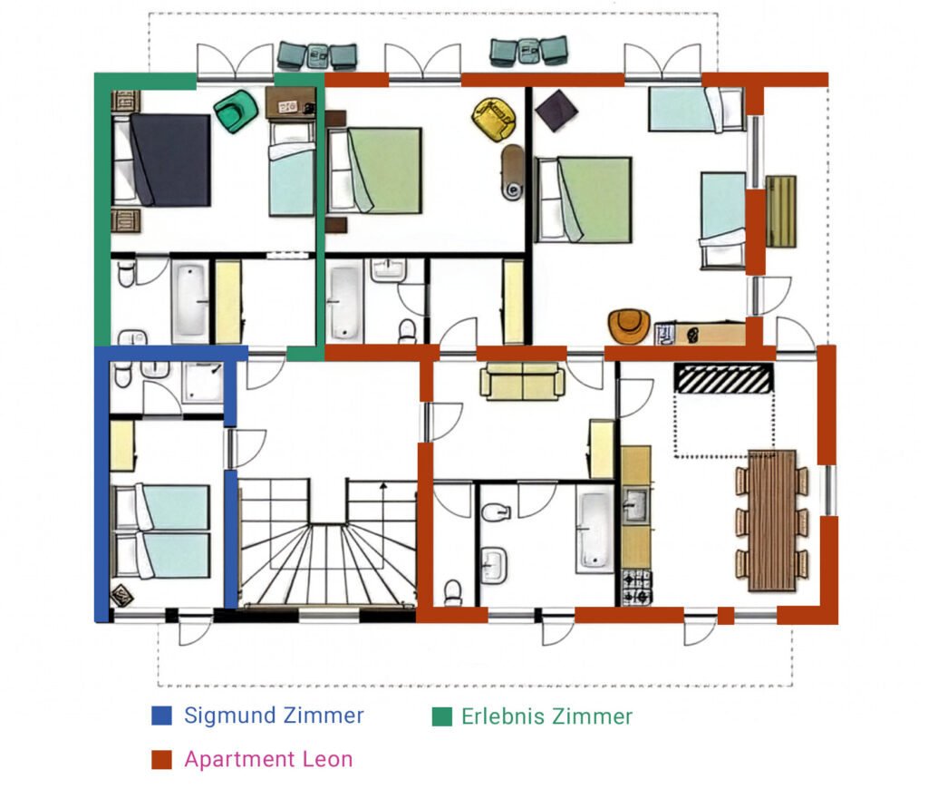 Zusätzlich liegt im linken Anbau in der ersten Etage das Apartment Hochsonnberg für 4 bis 8 Personen mit separatem Eingang. Dieses Apartment ist nicht Teil der Etage Leon.