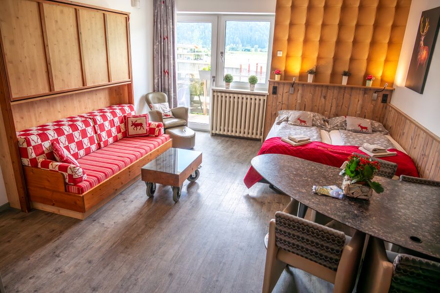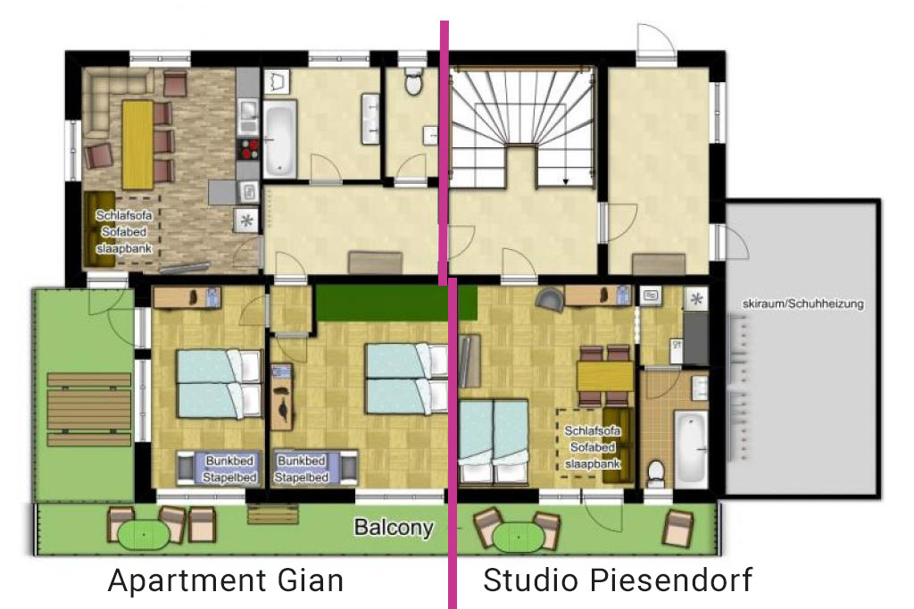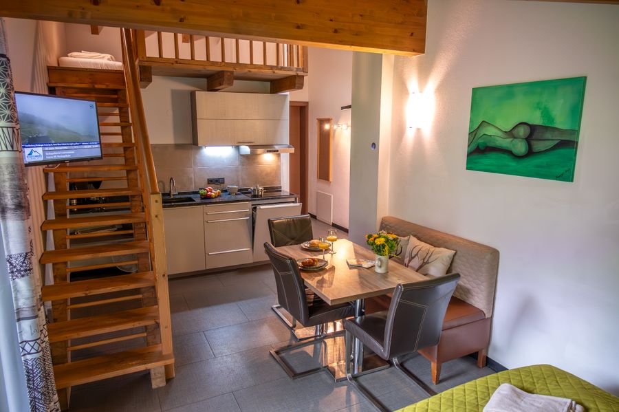 Im Erdgeschoss erwartet Sie die Etage Gian mit dem Apartment Gian (4-8 Personen) und dem Studio Piesendorf (2-4 Personen). Ob als komplette Etage oder einzeln als Apartment oder Studio – Sie wählen die passende Unterkunft.