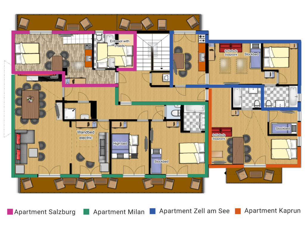 Sie umfasst die Apartments Milan (4–8 Personen), Salzburg (2–5 Personen), Kaprun (2–5 Personen) sowie Zell am See (2–6 Personen).